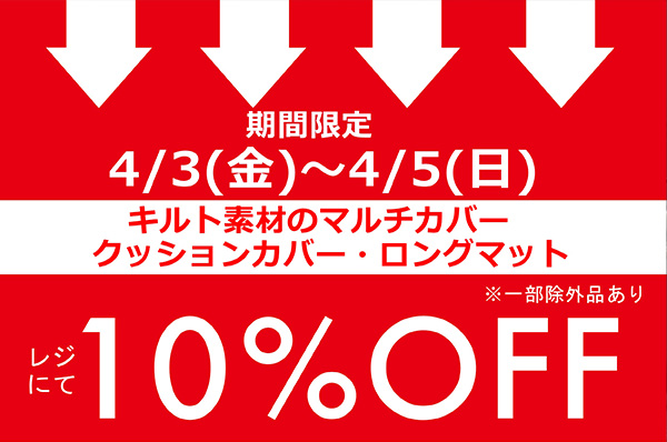 店舗限定!!キルト素材のマルチカバー・クッションカバー・ロングマットをお買い上げでレジにて 10%OFFキャンペーン
