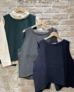 シンプルな形なので中に合わせるものを選ばず、気軽にカットソーやブラウス、ワンピースとの重ね着ができます!