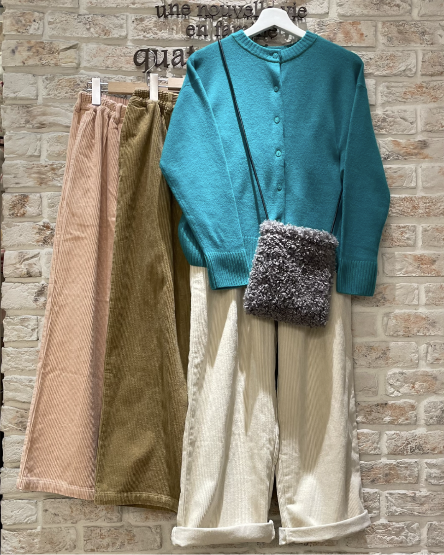 暖かみのあるコーデュロイ素材で、淡い色合いがナチュラルな雰囲気に。とても柔らかな肌触りで心地よく履いていただけます。