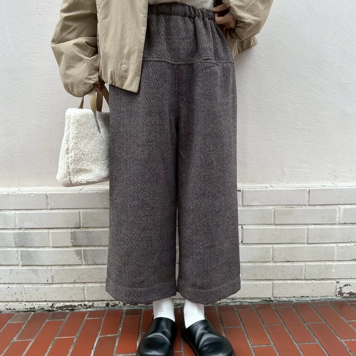 ウエストはゴム仕様、長すぎない丈感で足さばきも良いので、ストレスなく着ていただけます。