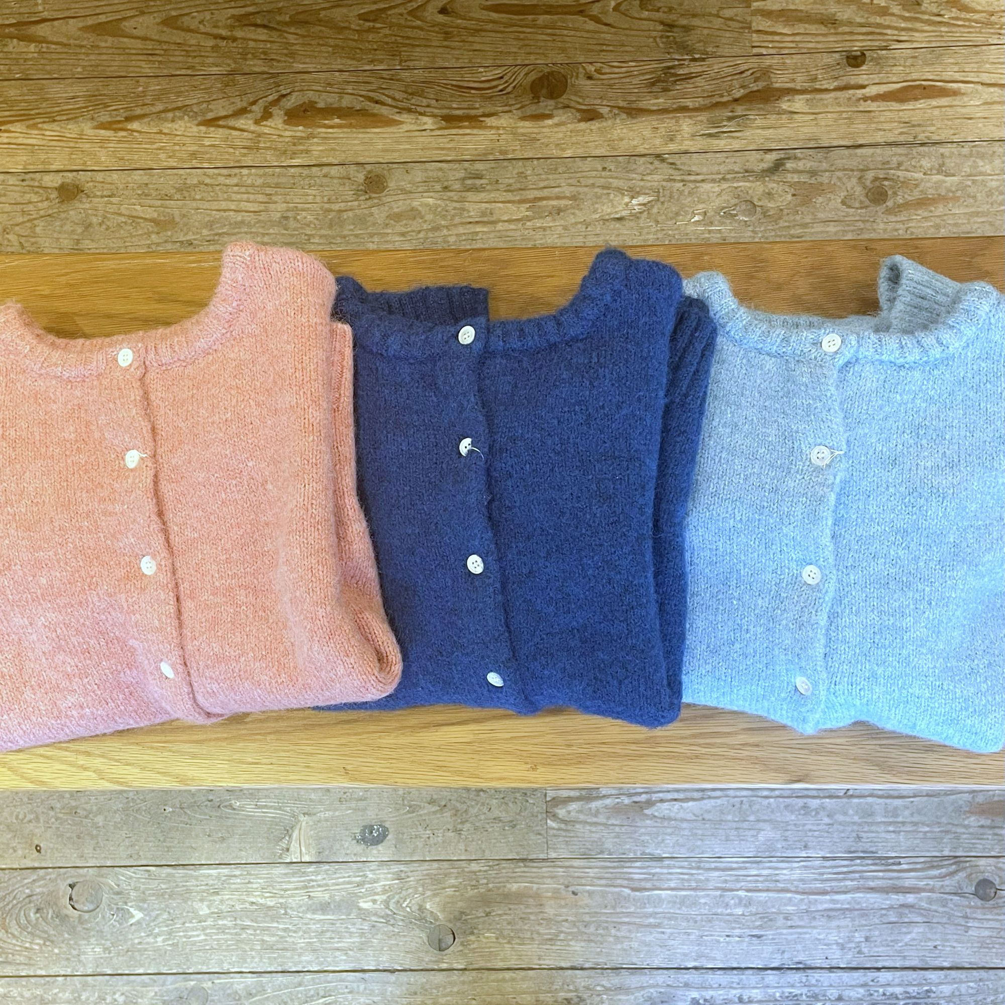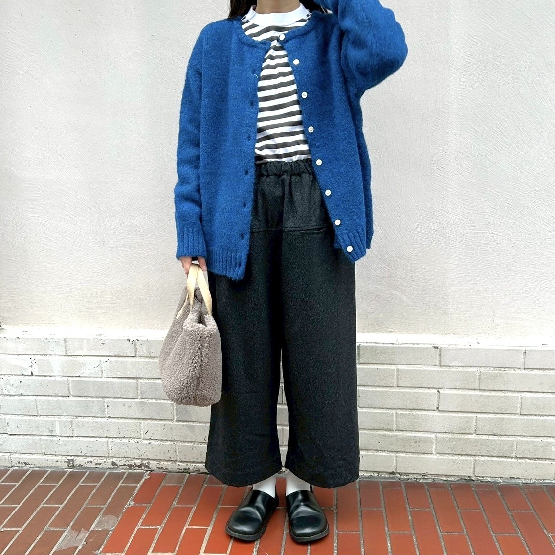 ボタンが白い貝釦になっているのがポイント。寒い冬でも気分が明るくなるようなカラー展開です。