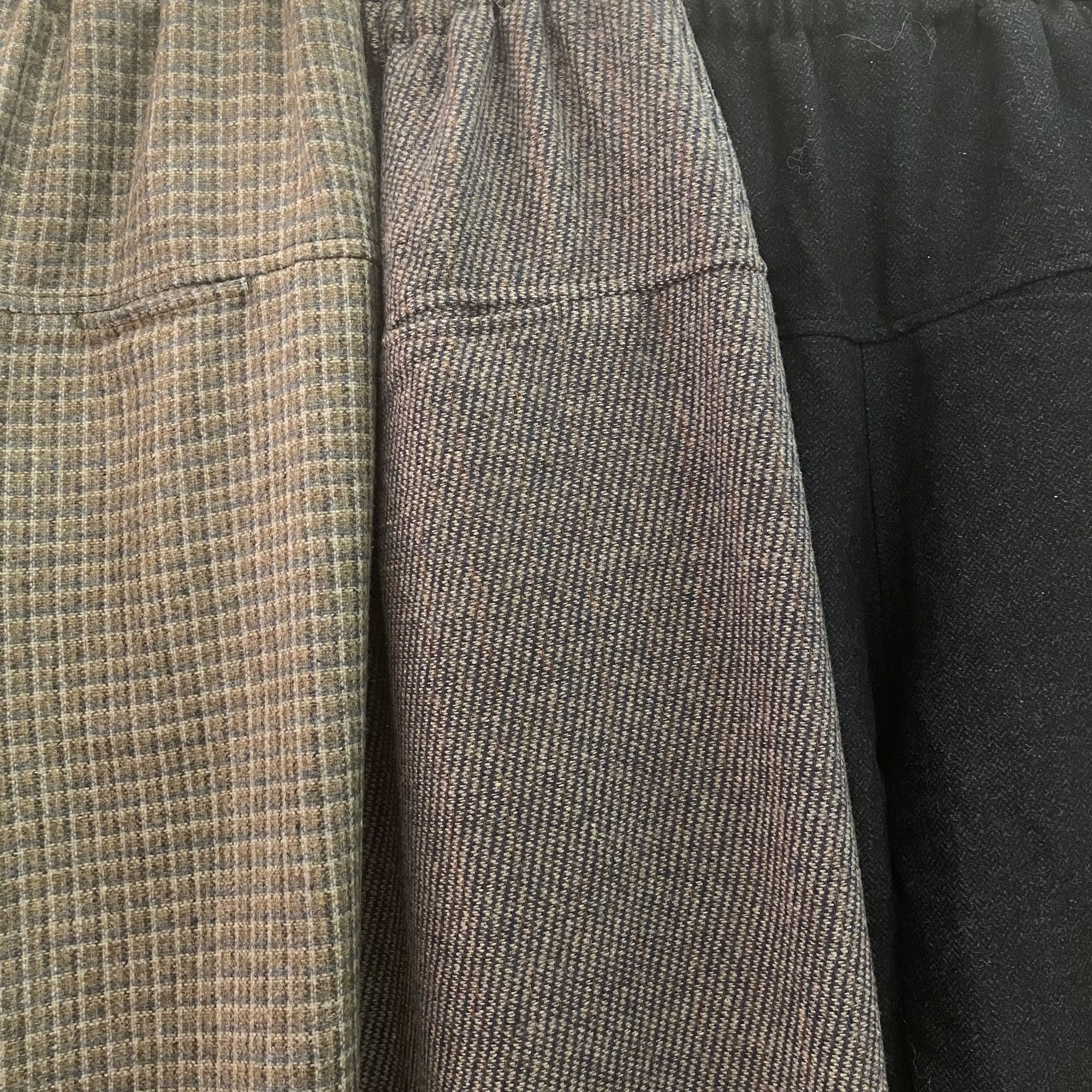 形はストレート、股上は深く、ストンとしたシルエットになっています。脇に縫い目がないのもシャムパンツの特徴です。