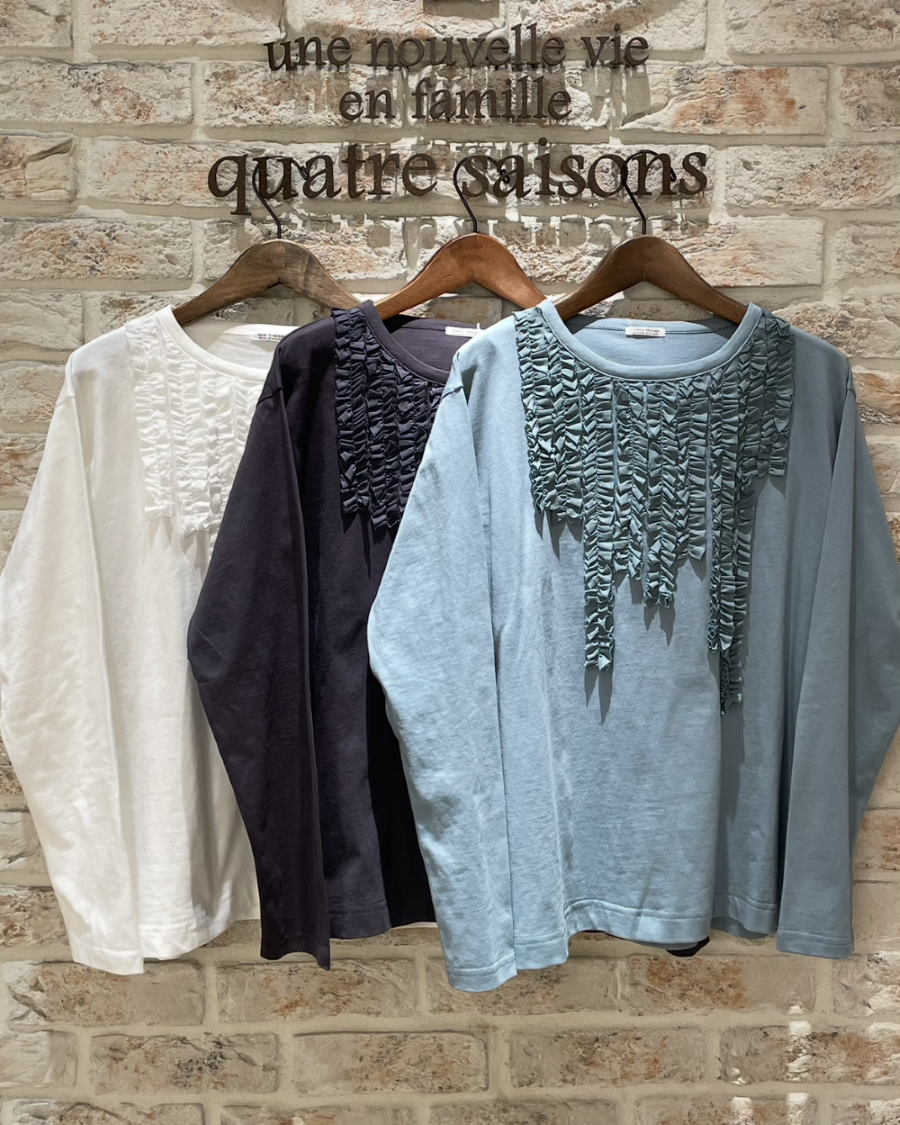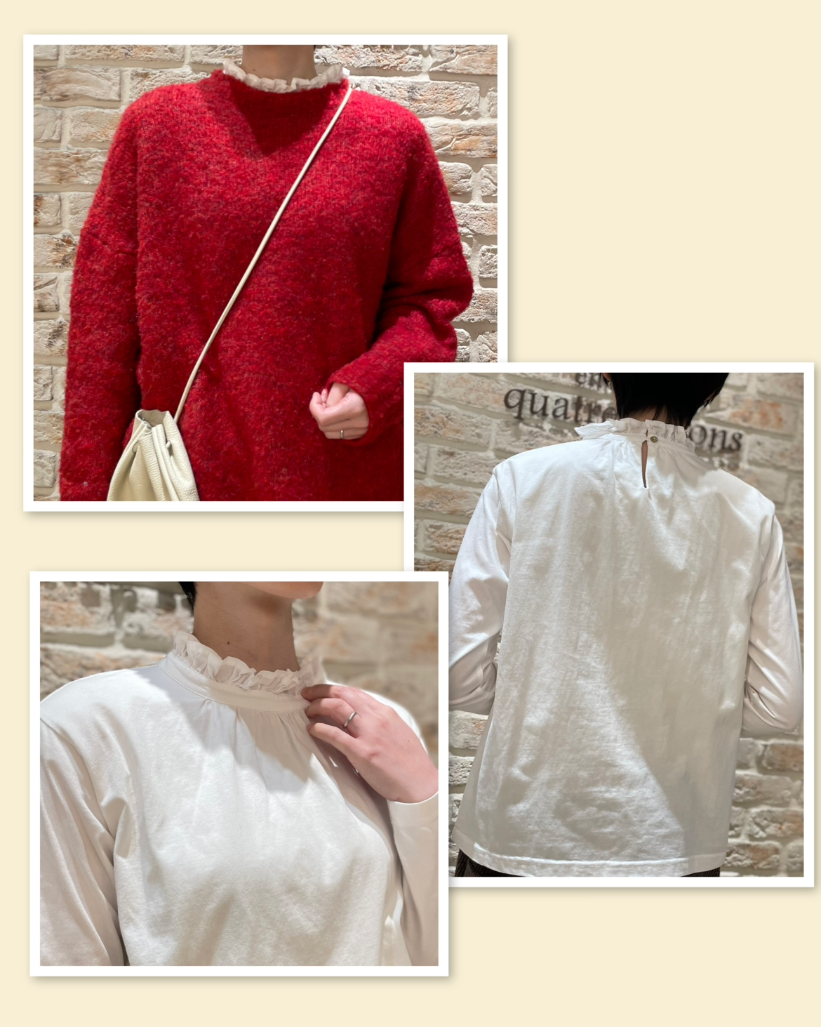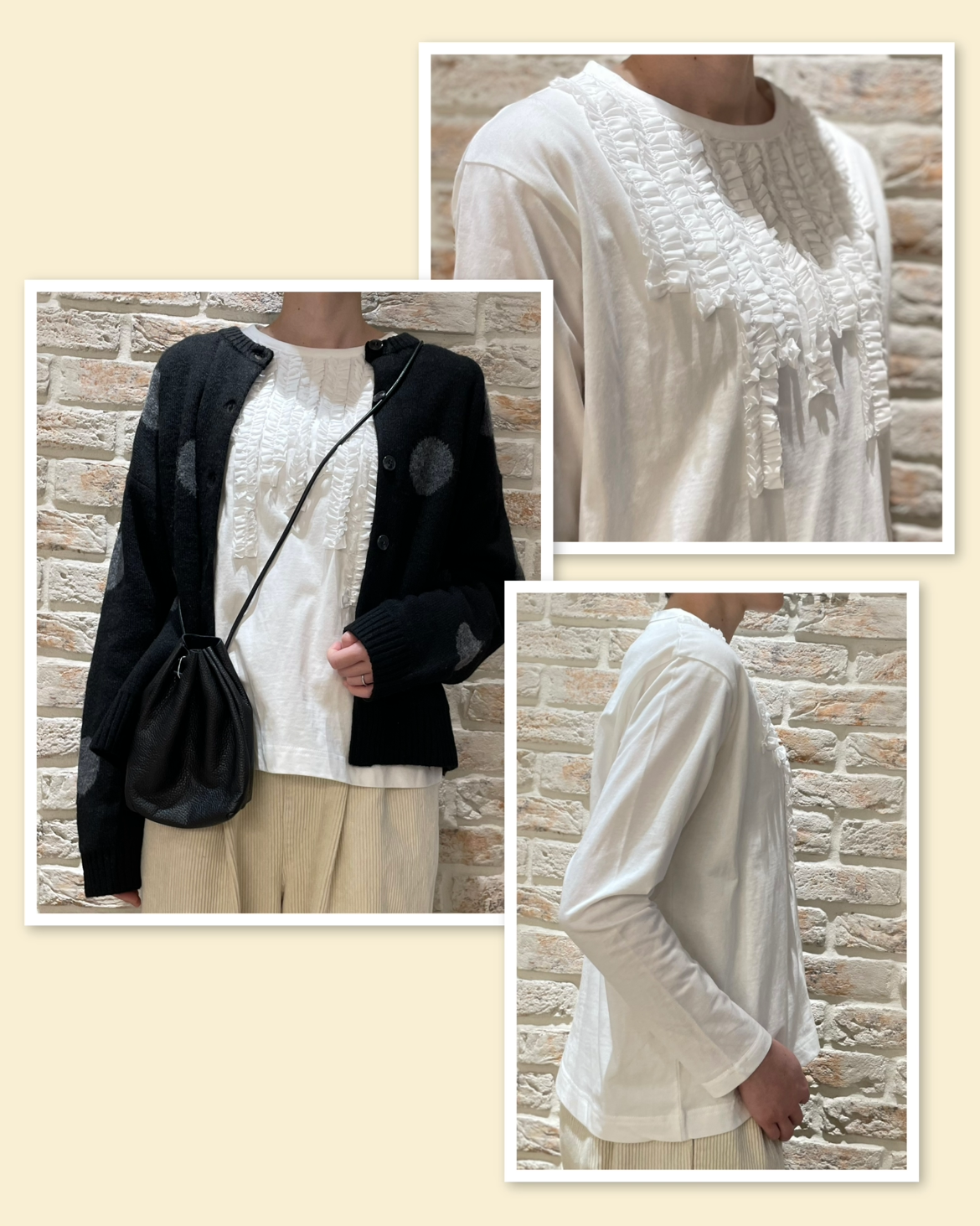 さりげないフリルなので、いつものコーディネートにちょっとプラスしたくなる一枚です。
