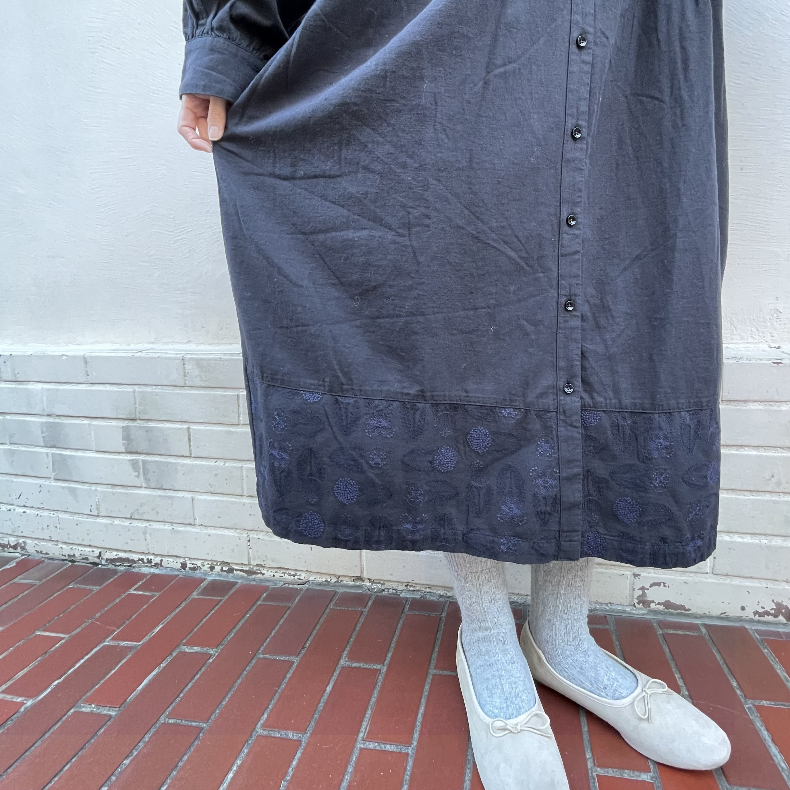 ウエスト切替でギャザーをたっぷり寄せてふわっとしたシルエットにしています。裾にも刺繍が入っているのがポイントです♪