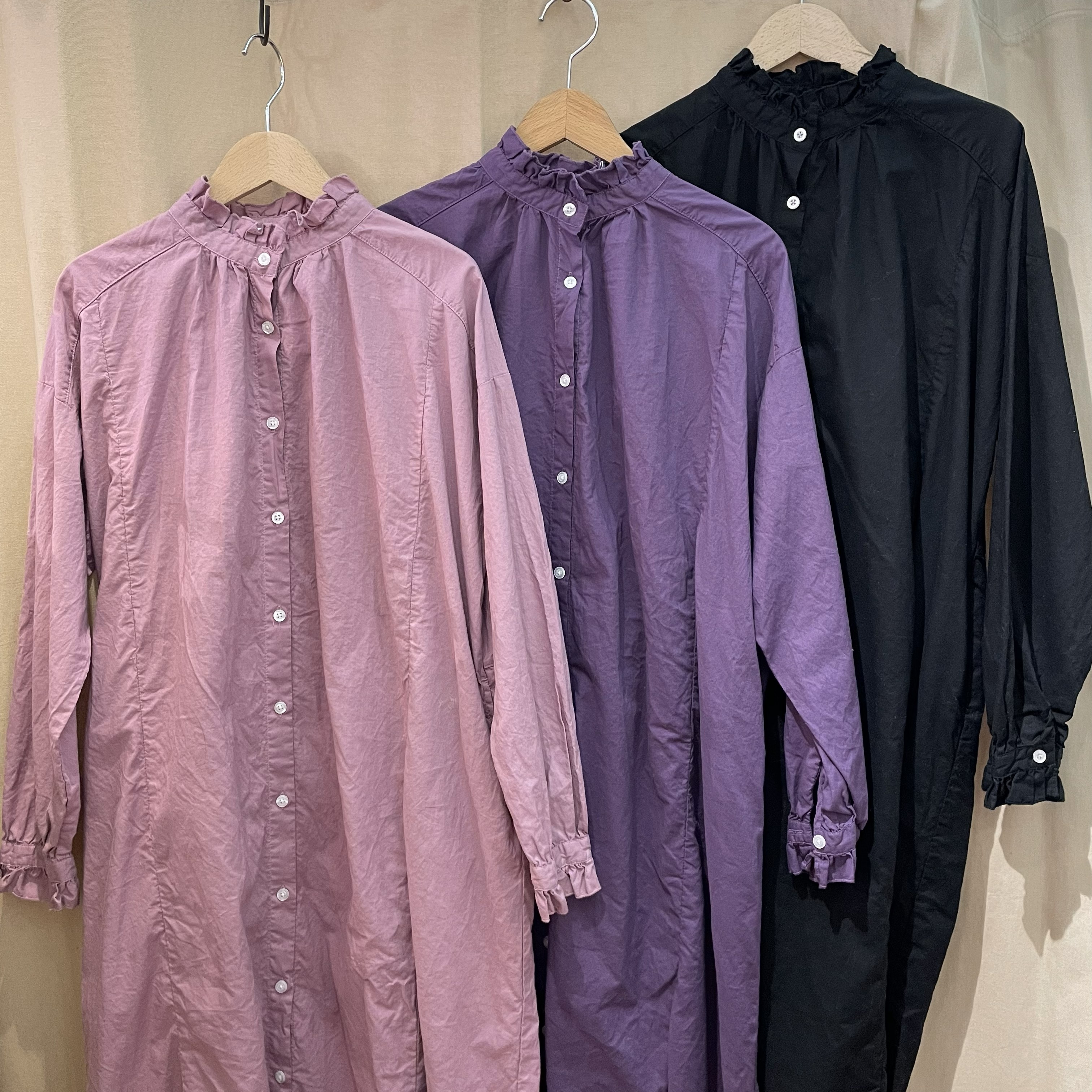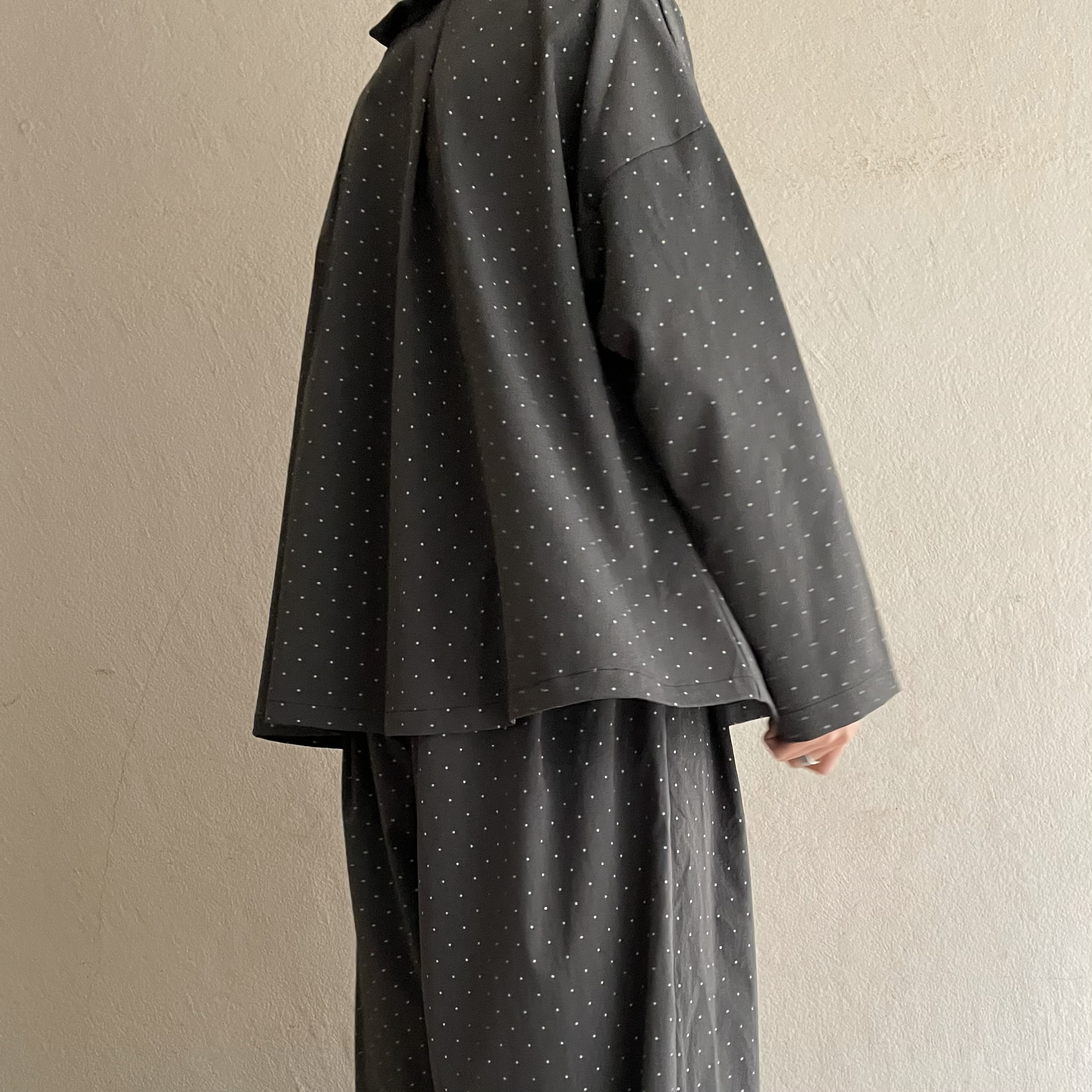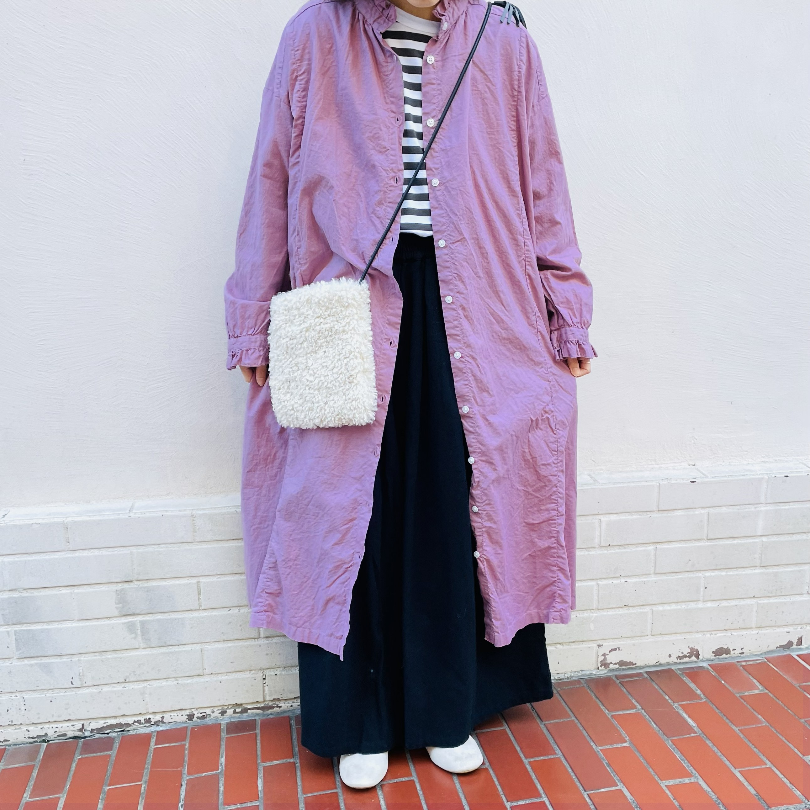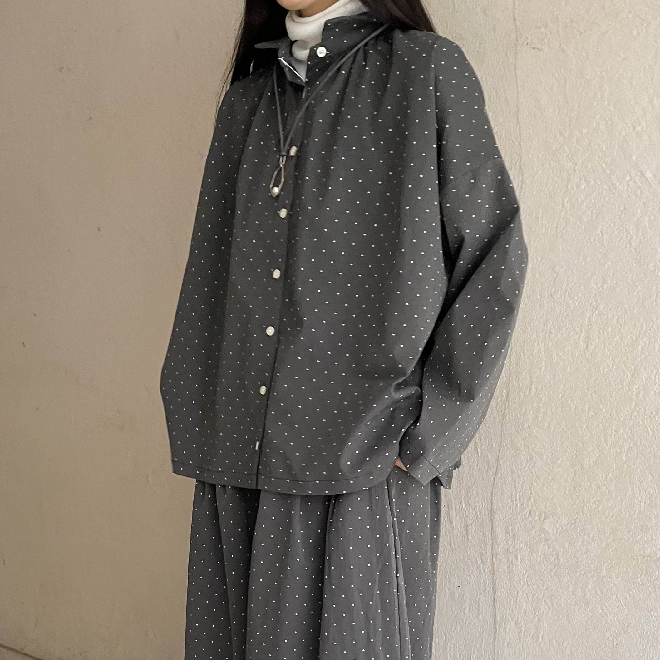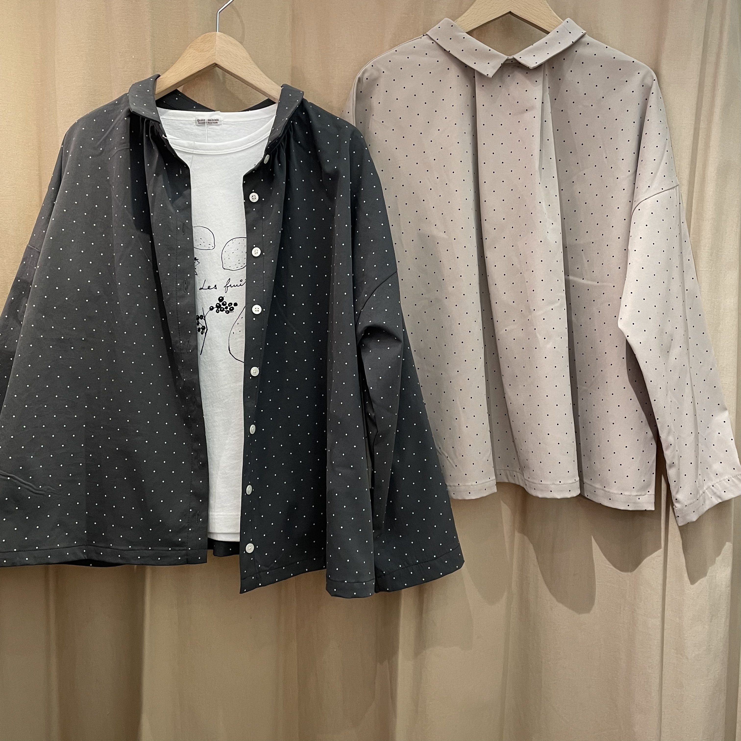 前あきのデザインで、袖にギャザーを入れてややゆとりのあるサイズ感です。