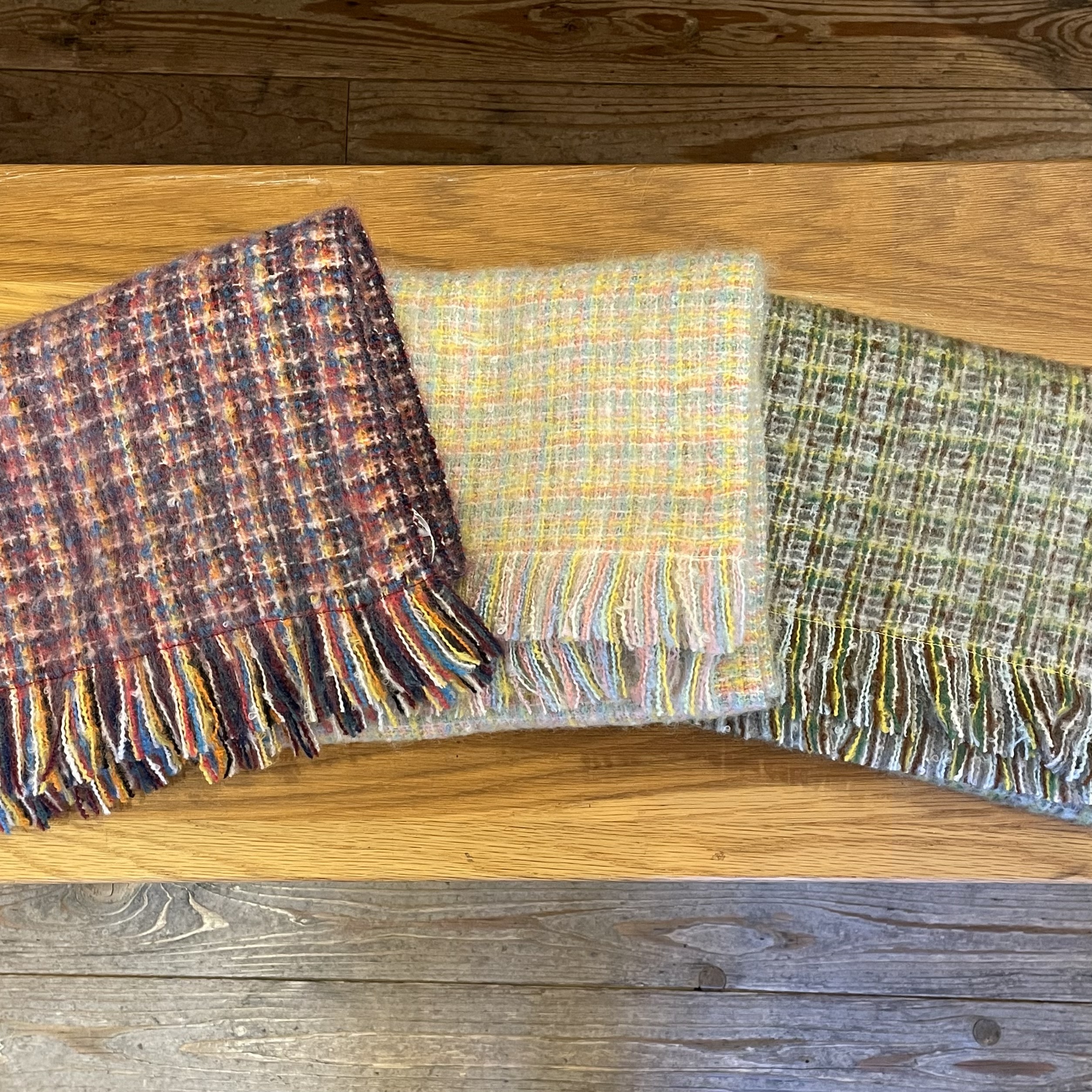 カラフルな糸で織られた細かいチェックが可愛いマフラー。様々な色とミックスになっていてお洋服とも合わせやすいです。