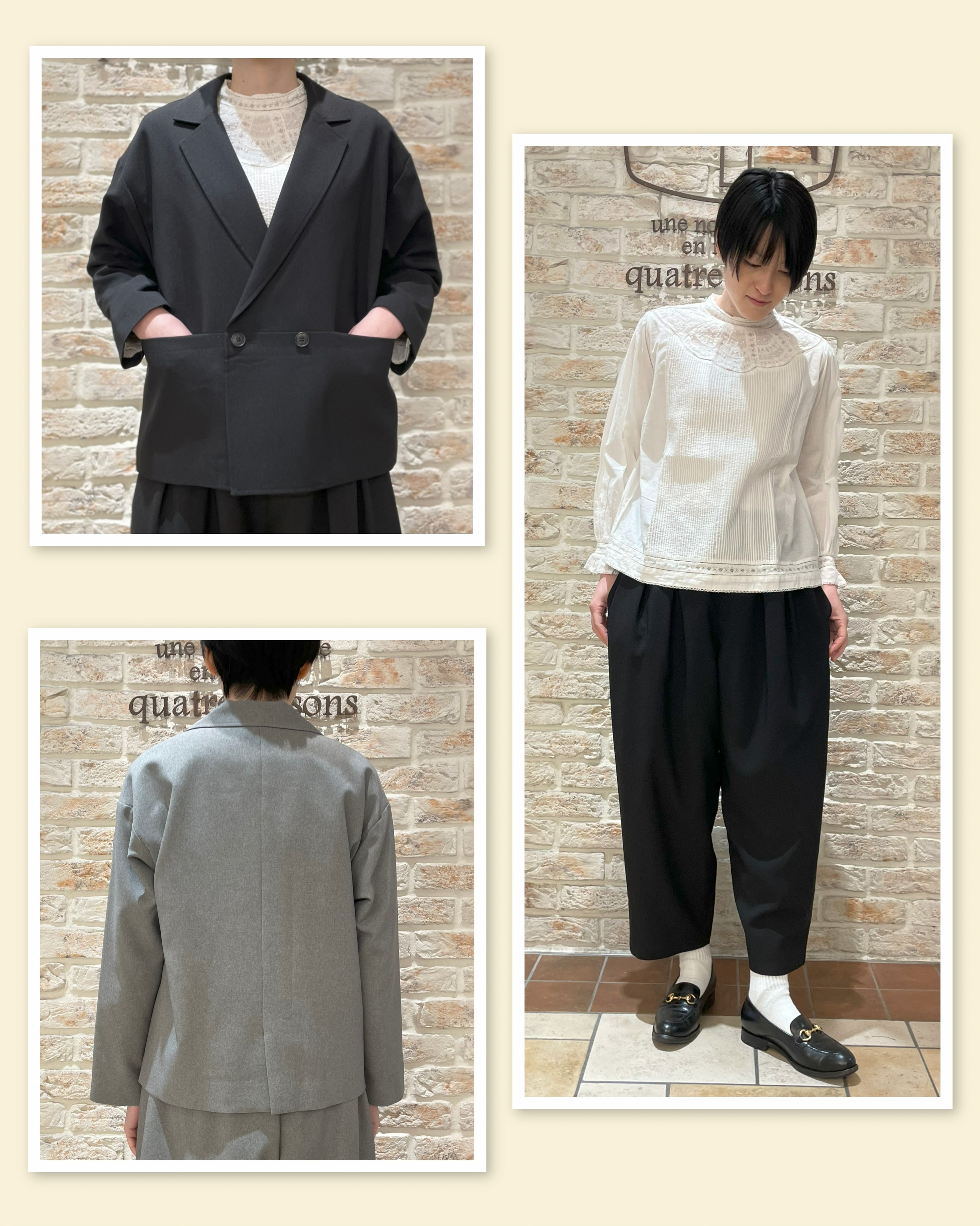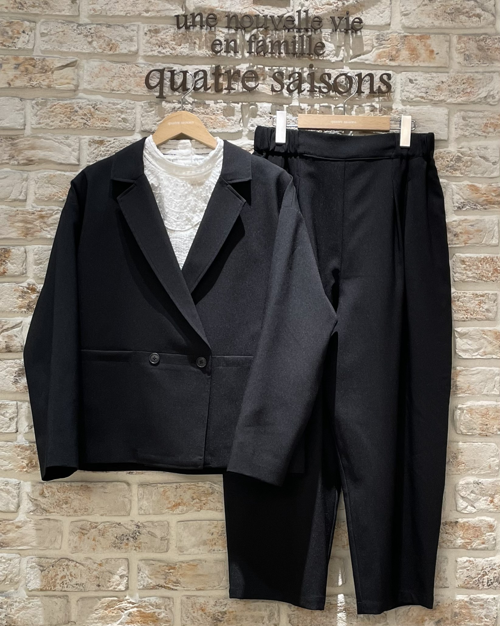 ジャケットはクラシカルなダブルボタン仕様で、ゆったりしつつも程よいきちんと感があり、セットアップはもちろん、ワンピースの羽織やオフィスシーンでも活躍してくれます。