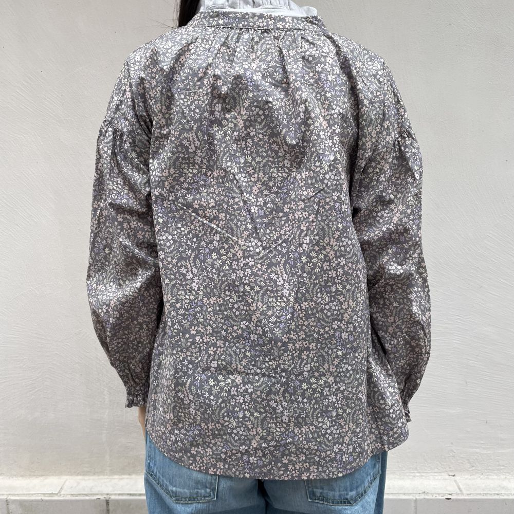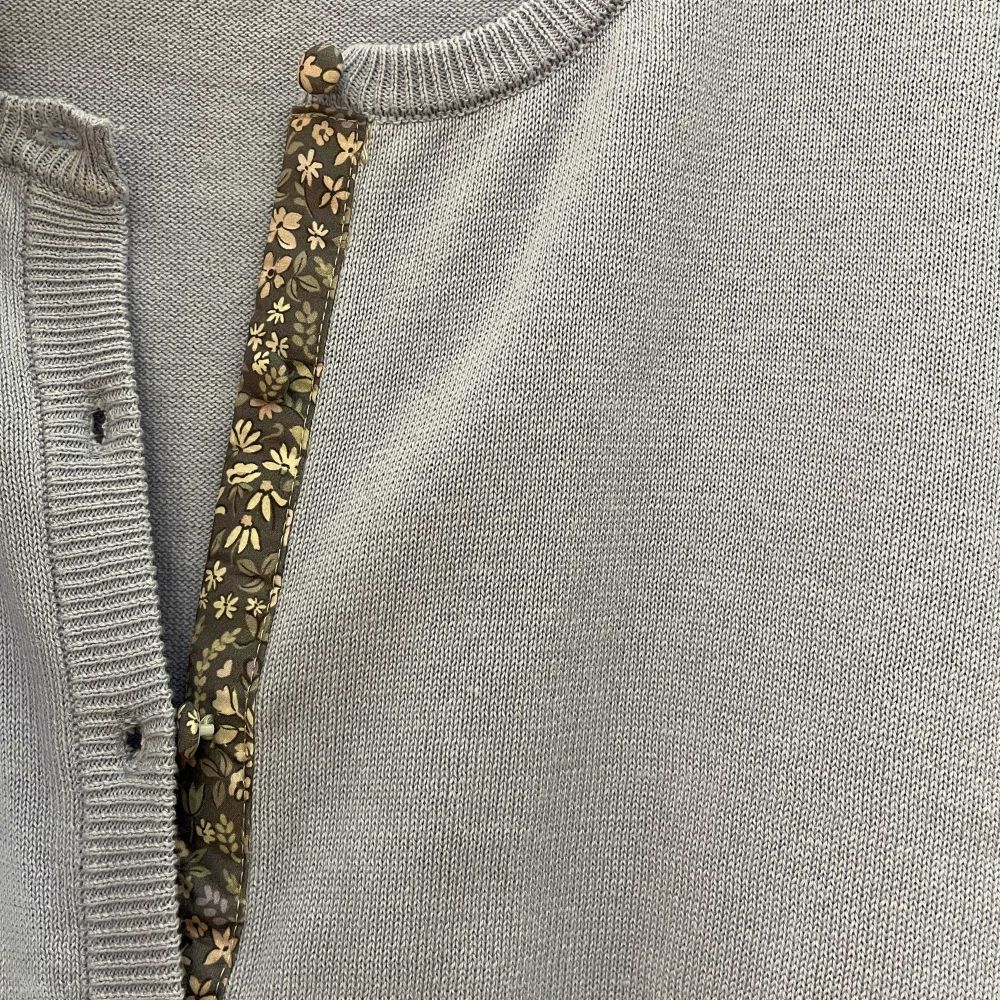 釦と左あき部分に花柄生地を使用したカーディガン。
