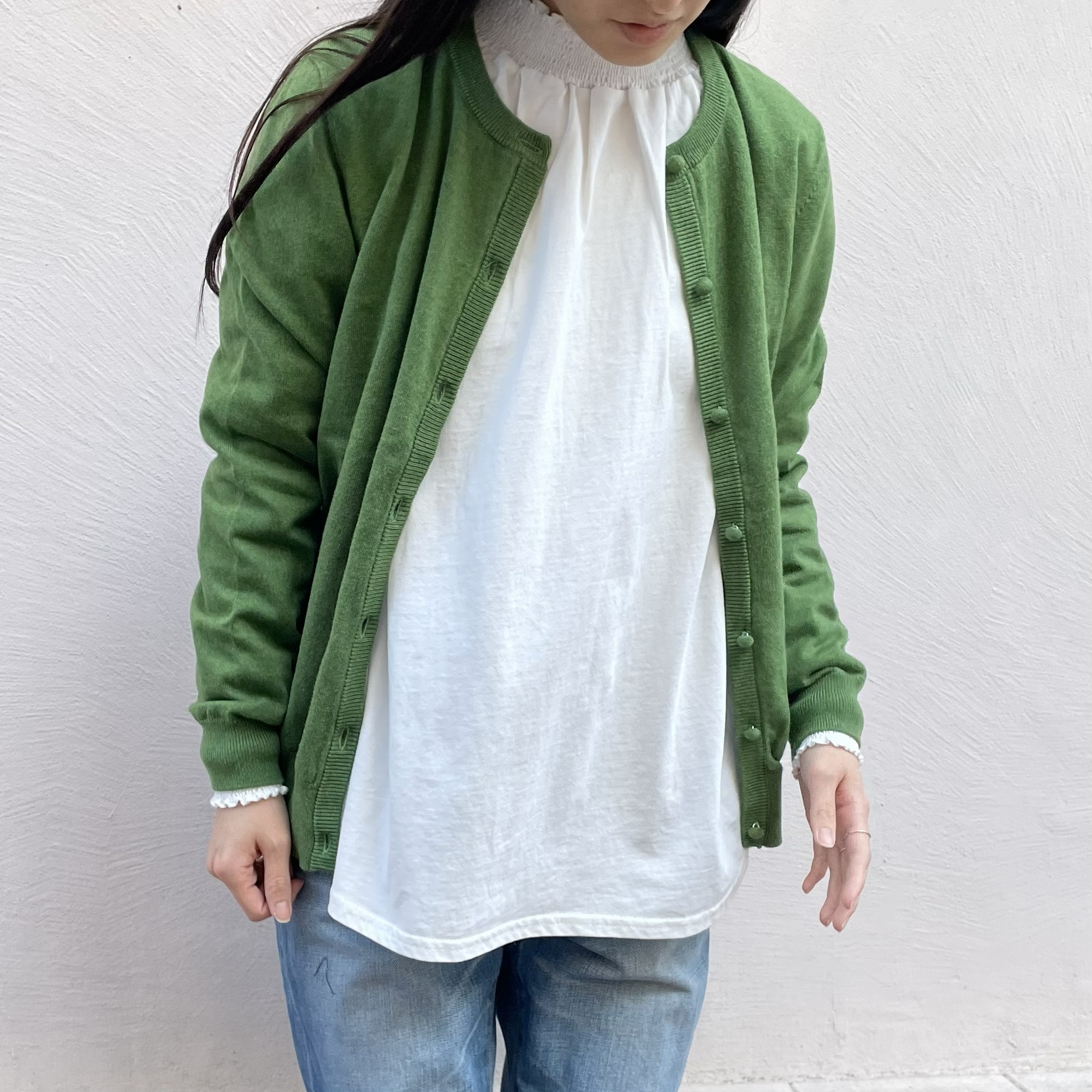 ころんとついている同じ編地のくるみボタンが可愛らしいカーディガン。綿素材にウールとカシミヤをミックスして少しあたたかみを持たせています。