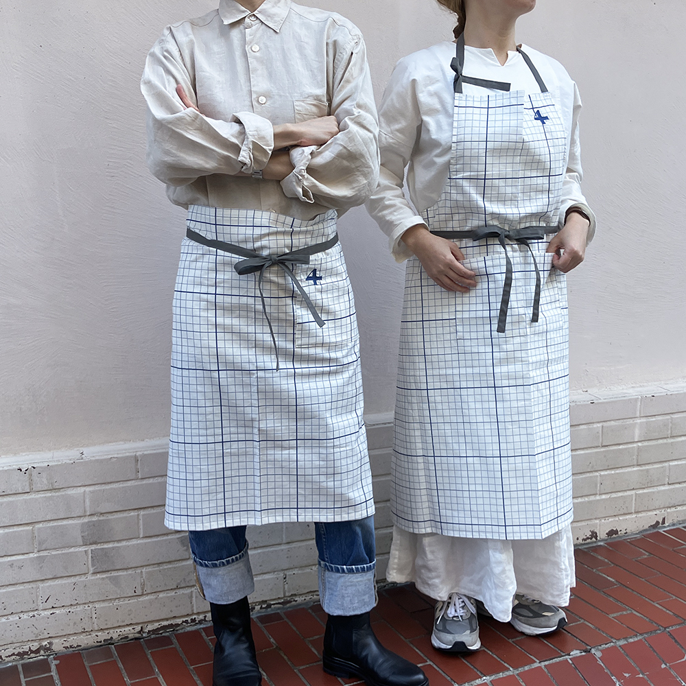 エプロンはフルタイプとギャルソンタイプと2つご用意。男女問わずお使い頂けるように、首・腰紐を引き締まるグレーにして、おしゃれ心を取り入れました。