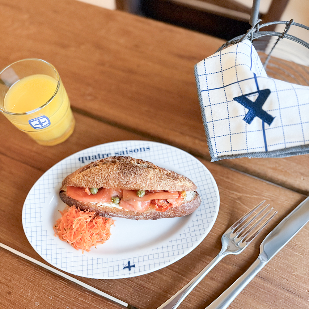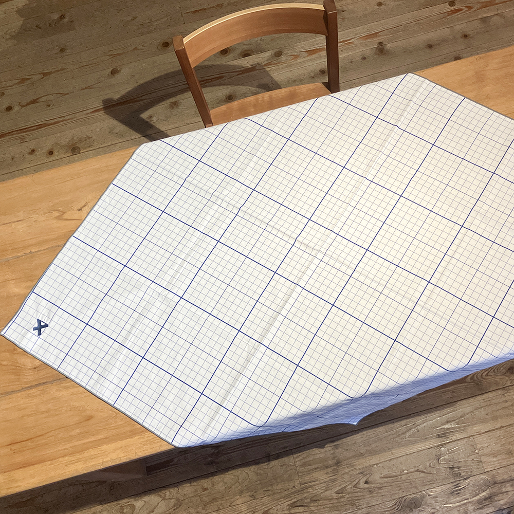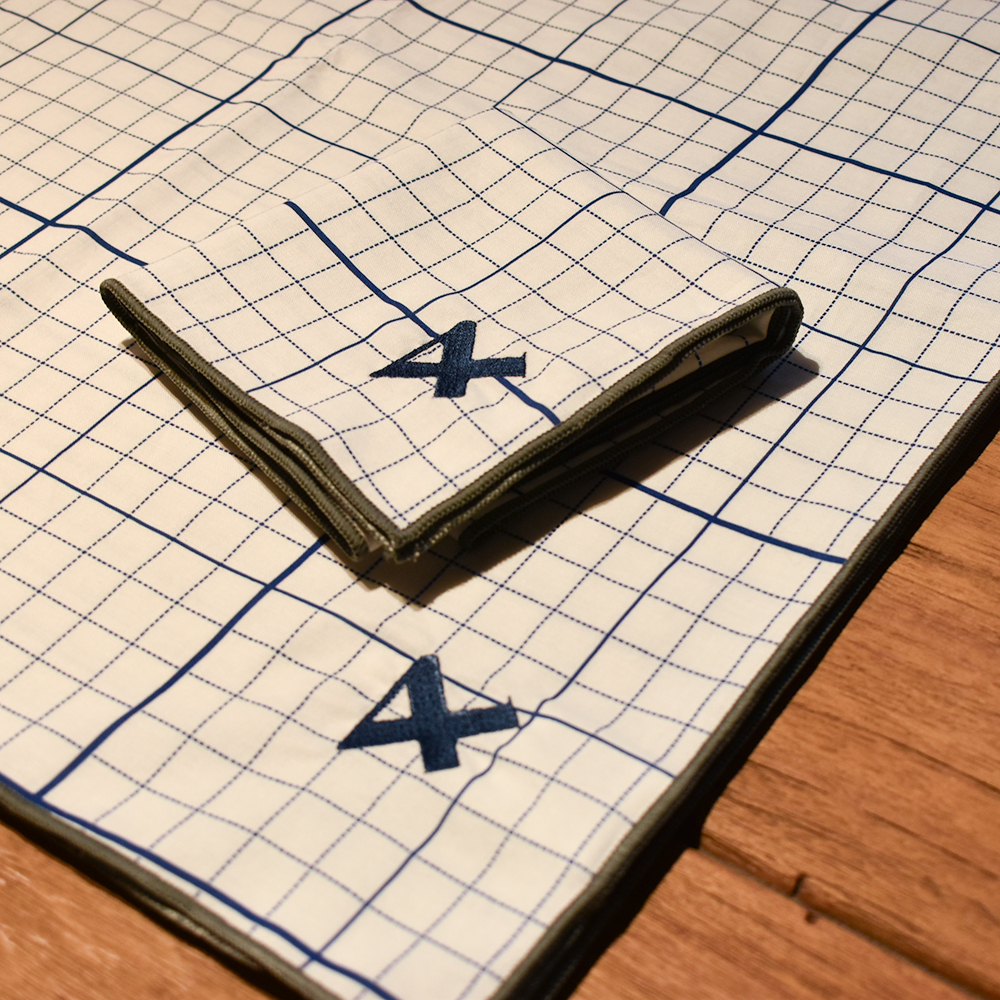 合わせるクロスは、パリのビストロで見かける定番の赤いギンガムチェックのテーブルクロスのような位置づけになればと思い、ブルーのグリッド(方眼)デザインで作りました。