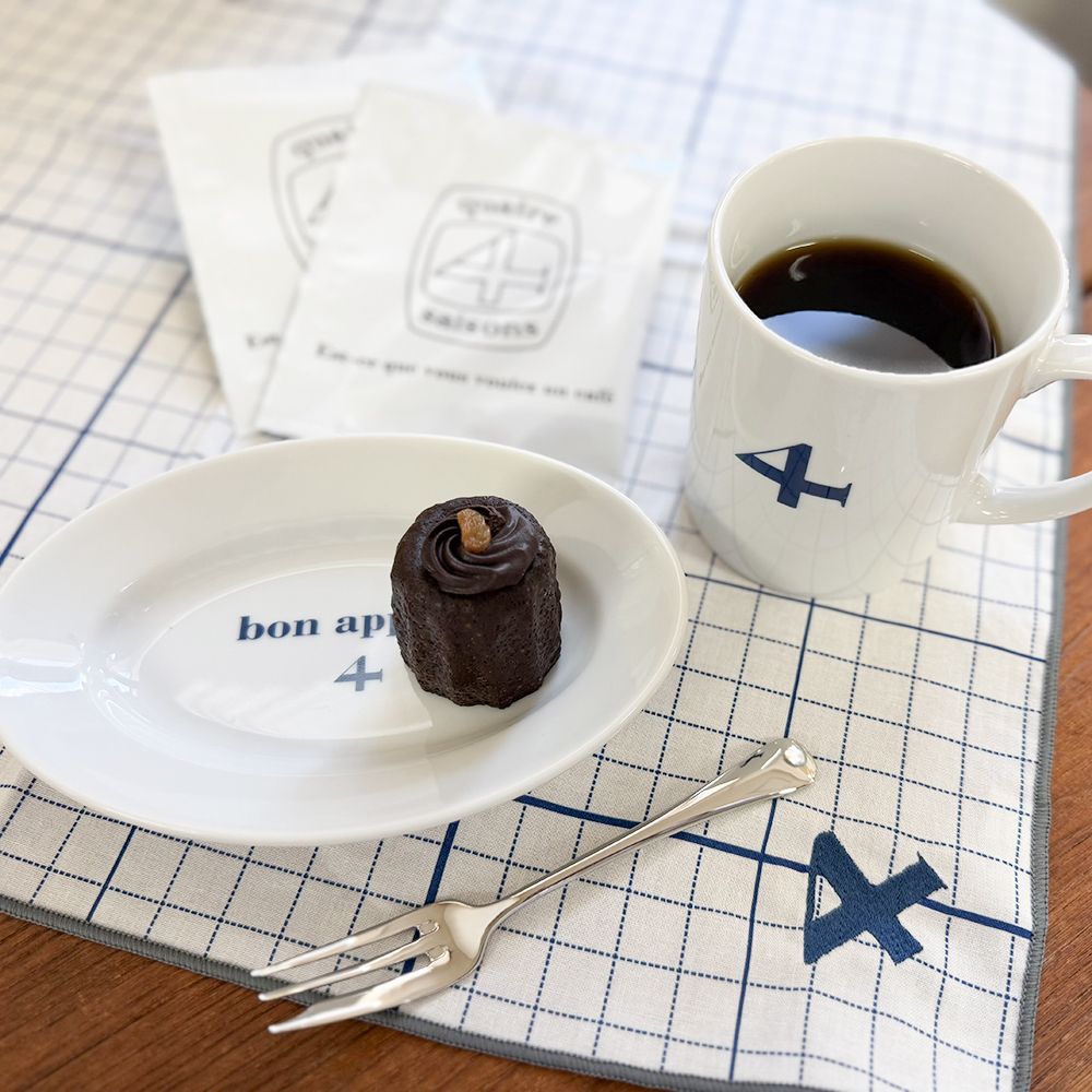 マグの持ち手部分に「quatre saisons」のロゴをつけ、裏面には「コーヒー一杯いかがですか?」のフランス語の遊び心をデザインしました。容量は300cc、たっぷりのコーヒーが入る大きさです。