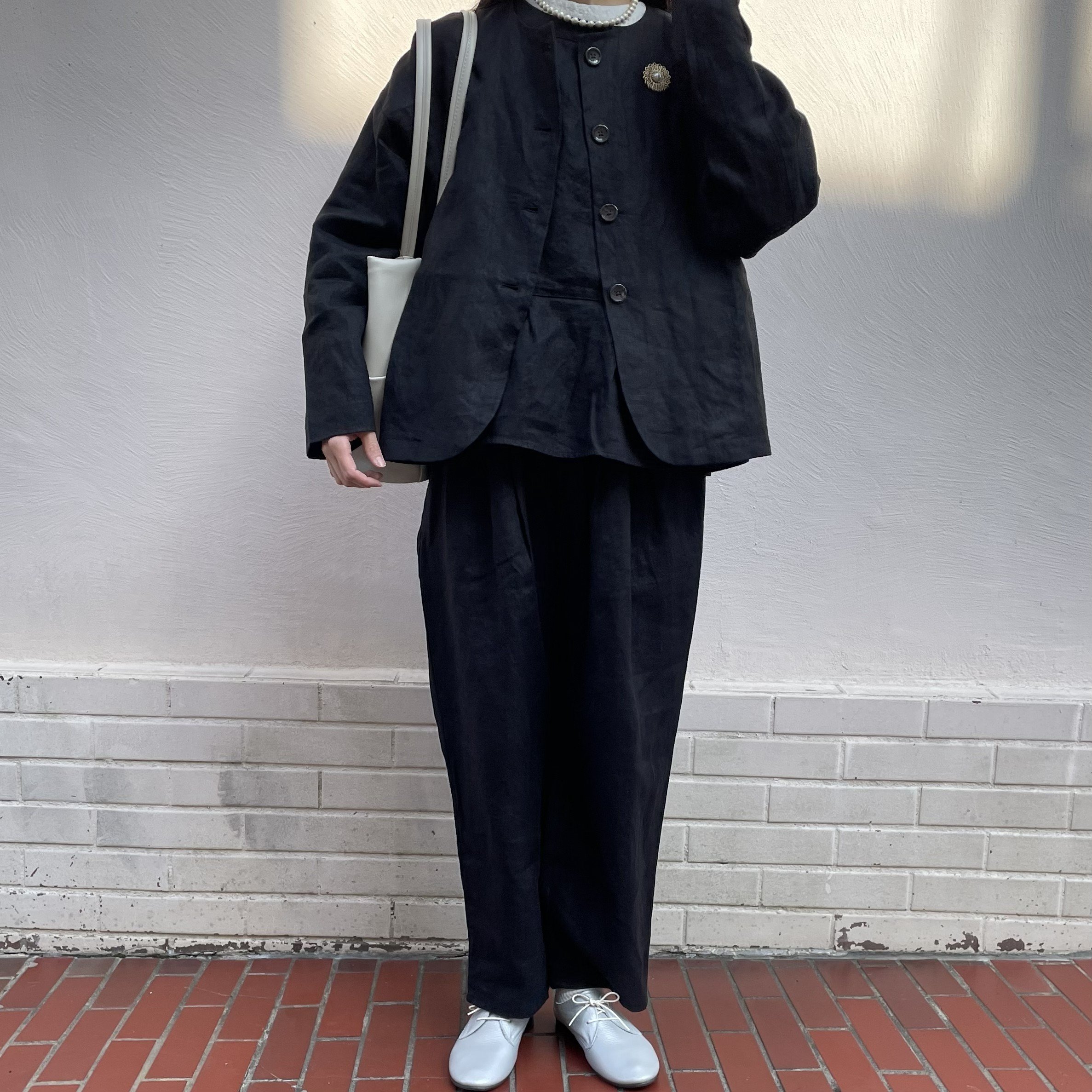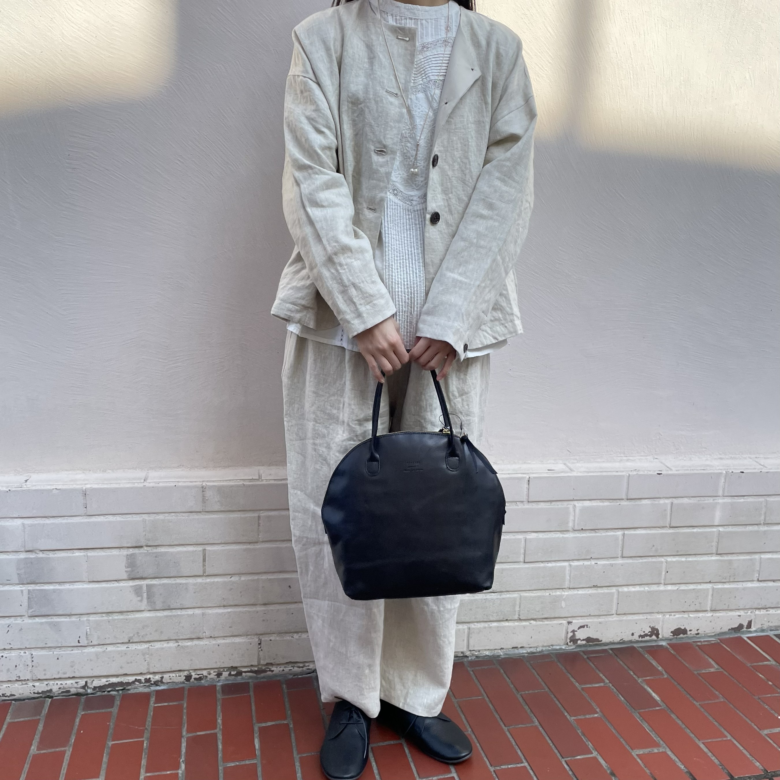 麻の持つ光沢感が上品な印象を与え、ナチュラルながらきちんと感もあります。