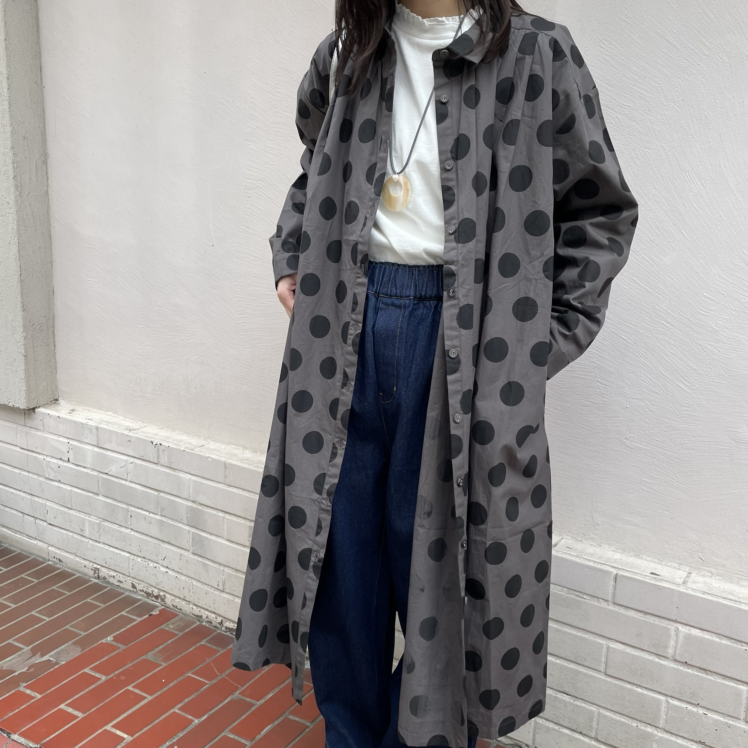 無地ライクな配色使いで大きい柄ながらも着やすい配色をしているので、普段柄のあるお洋服をあまりお召しにならない方にもおすすめ。素材はしっかりしたハリのあるポプリン素材を使用しており、通年着られます。