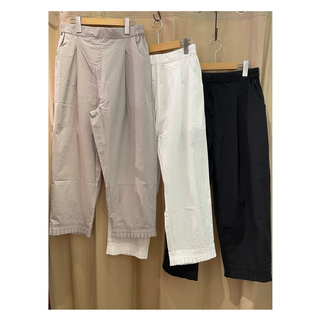 裾にプリーツが入ったデザイン性の高いパンツ。薄手のコットンが気持ちよい素材を使用しているので、暑くなっても快適に穿けます。そのままではもちろん、裾を折り返して穿くとまた違った雰囲気を楽しめます。