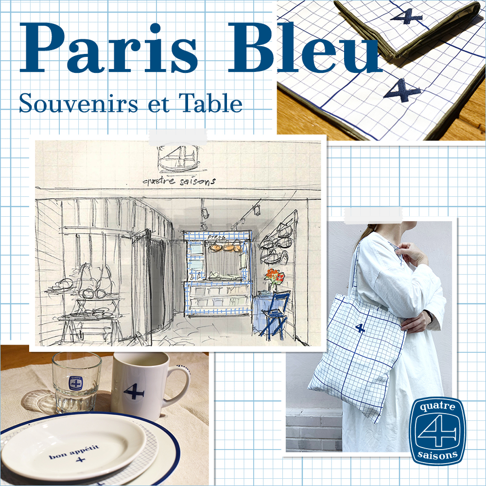 テーマカラー「Paris Bleu パリ・ブルー」を使った食器やリネン類などが賑やかに並ぶ、キャトル・セゾン全店でご好評いただいておりますコレクションをOPENからすぐに販売致します!