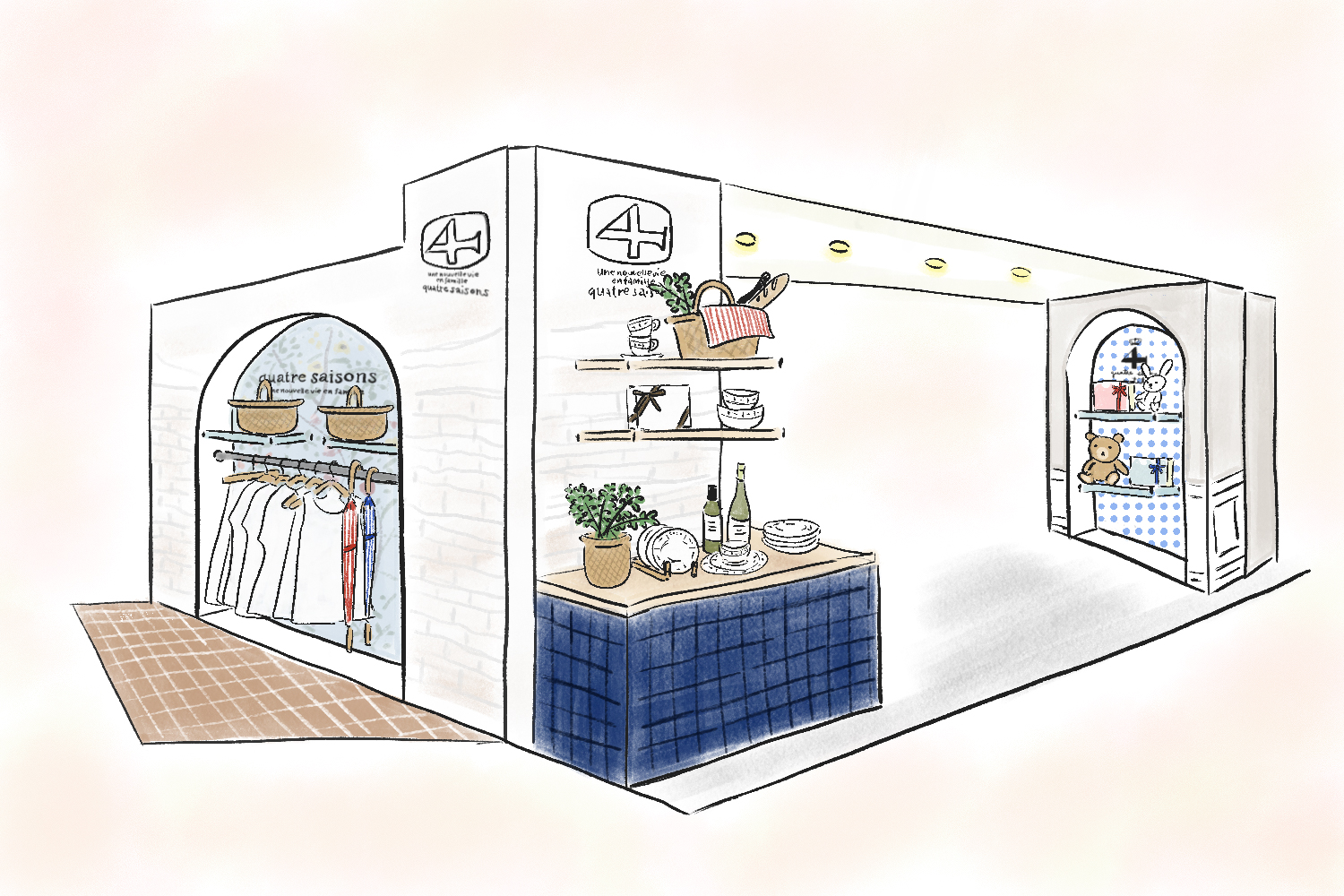 従来のキャトル・セゾンの店舗はナチュラルで優しく穏やかな雰囲気を基本としていますが、日吉東急アベニューではコーナー毎に床や壁の素材をかえたり、パリのパッサージュを思わせるようなアーチ状の棚を壁面に設けるなど、新しい雰囲気を感じていいただけるような演出を施しました。